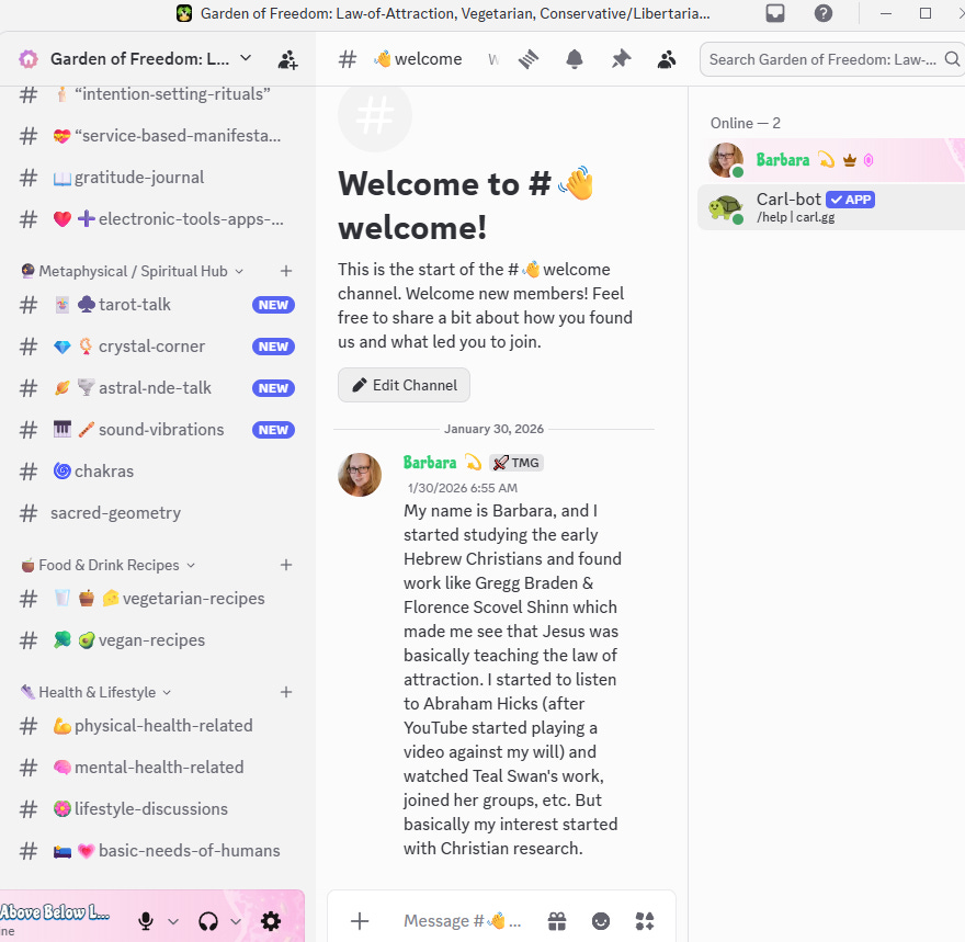 I made a discord server, “Garden of Freedom: Law‑of‑Attraction, Vegetarian, Conservative/Libertarian Community.” Let me explain the title. It may change over time, but here’s why I put it this way to begin with….